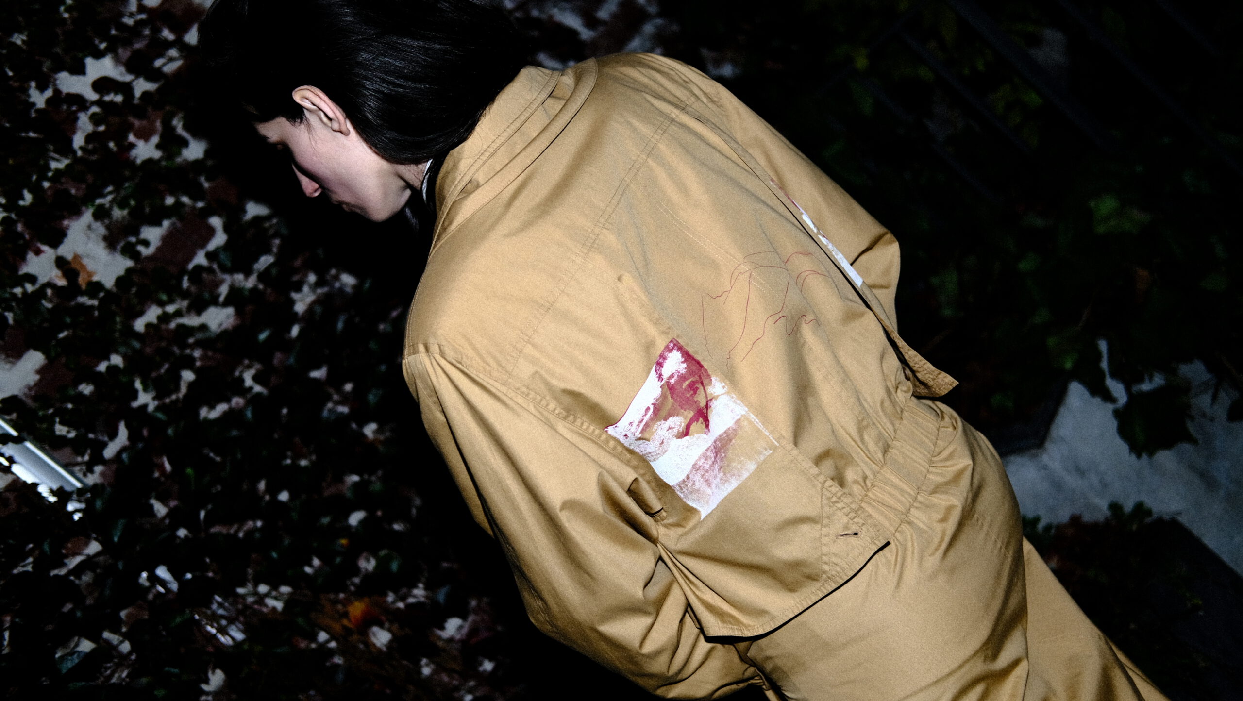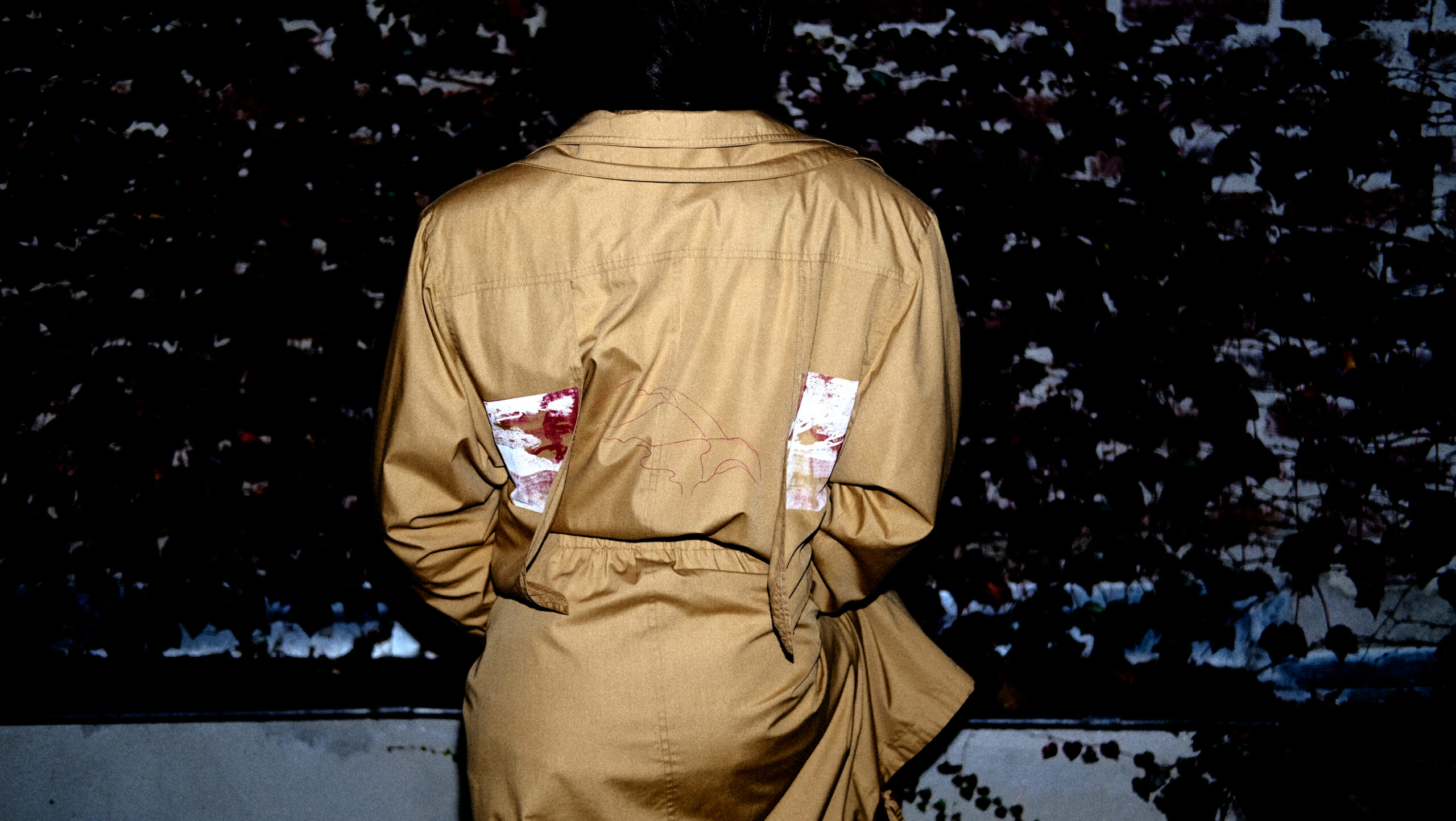 is an abstract picture of a magnificent mountain and see landscape. Representing the memories of a day in nature. In the inside of the coat you can find an entire map of Africa. It’s a really special and unique coat which has some trench-coat characteristics. But it’s unique in its own way.