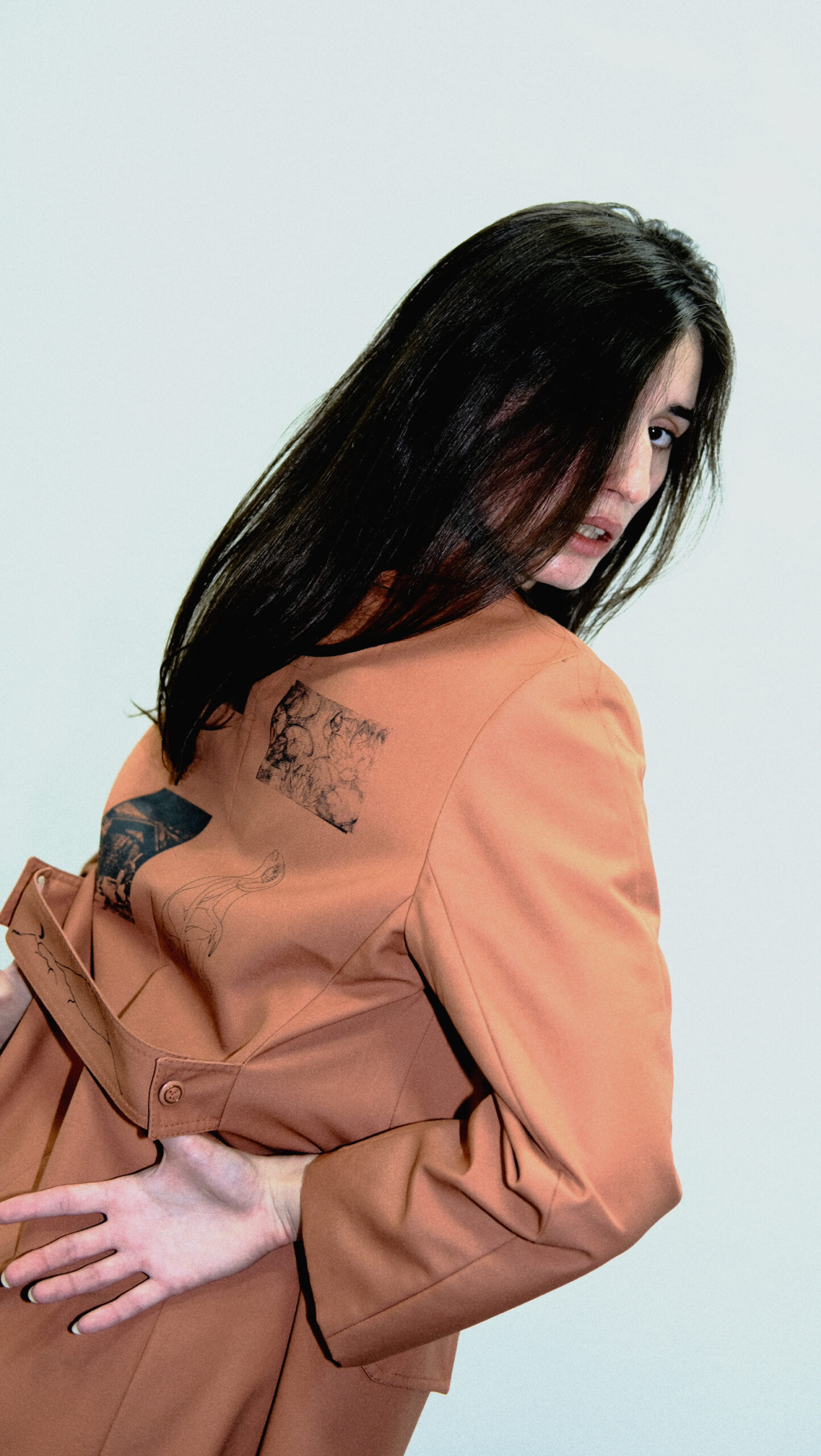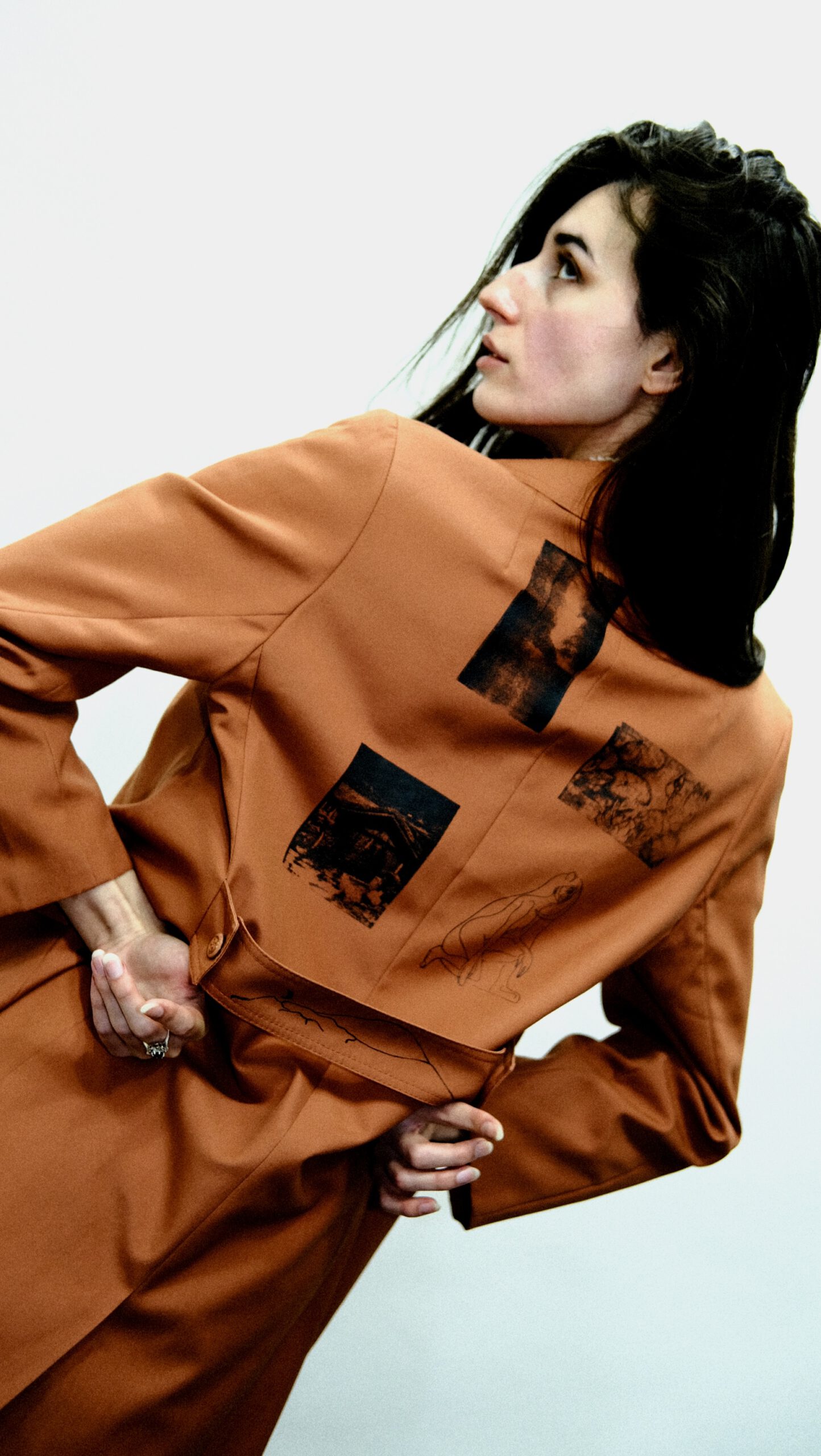 As part of the sketchbook collection different types of pictures and hand drawings are printed on the coat with the Katagami printing Technic. Encompassing the woman-lioness drawing, a waterfall from the other side of the world, a house in the mountains of Nepal – which could also be somewhere in the mountains of Switzerland and a drawing of some waterlily’s which are adding a more natural part to it.