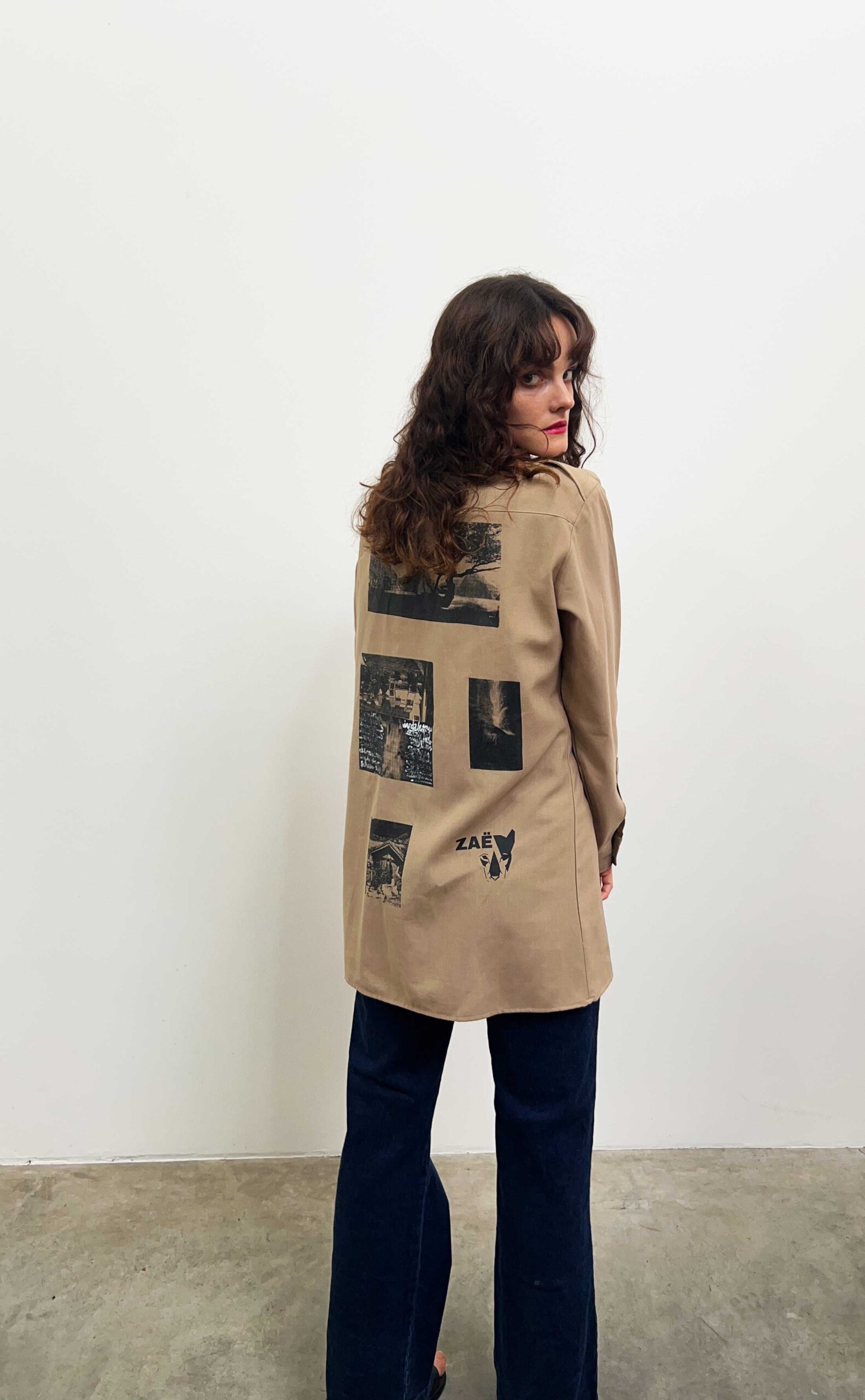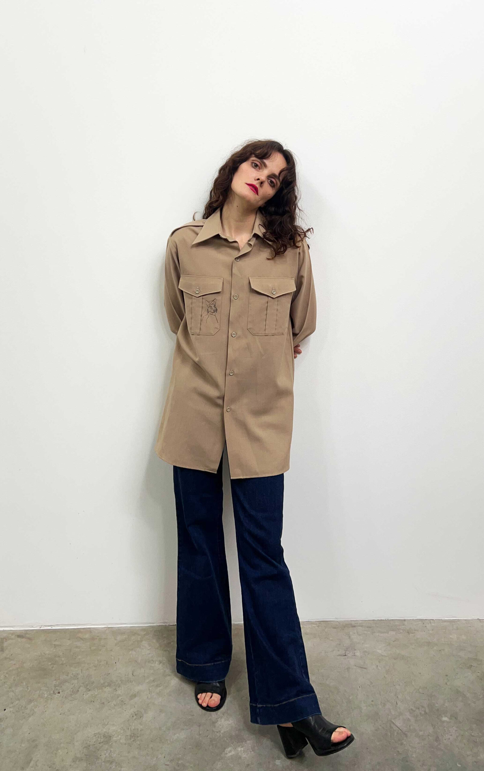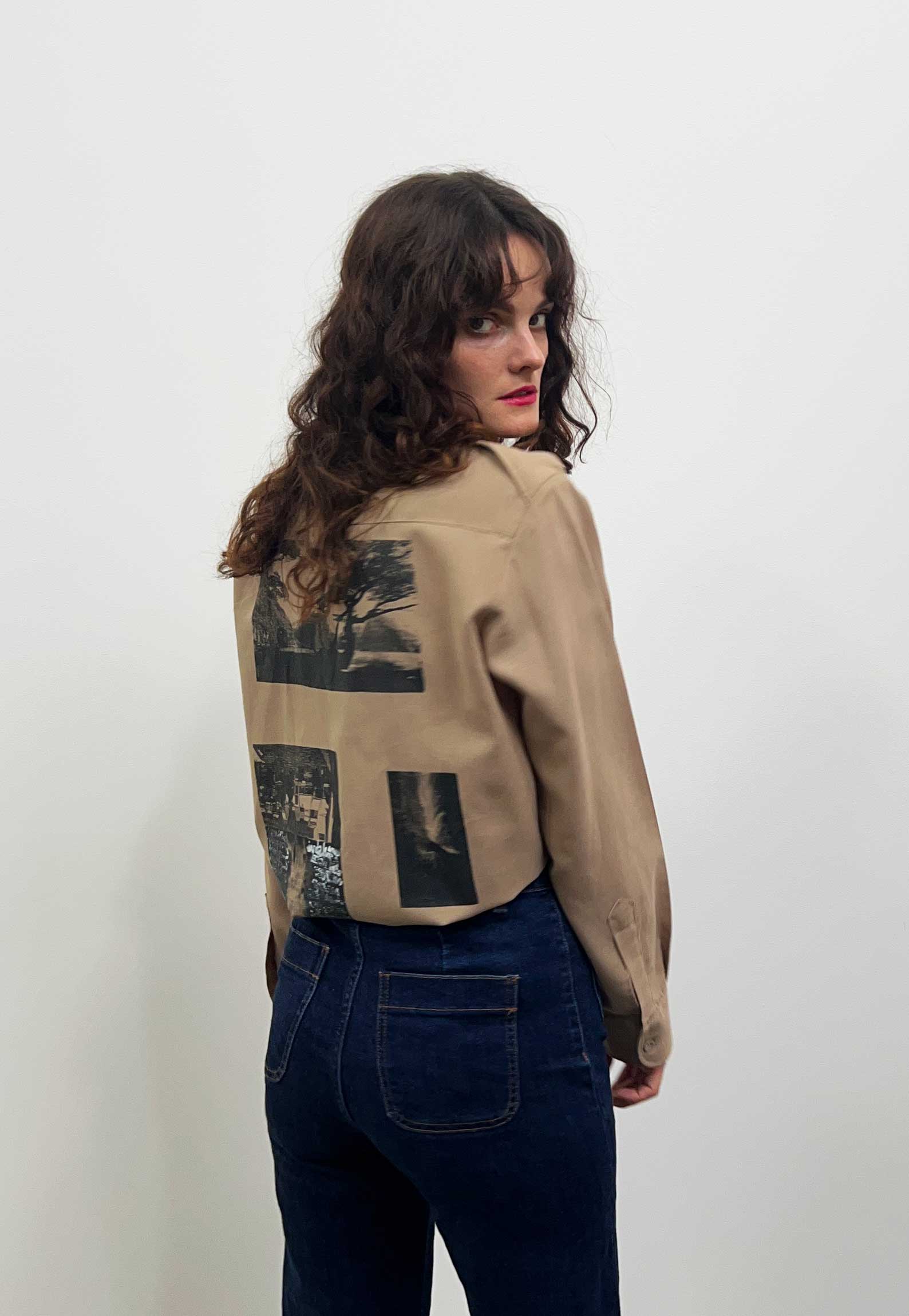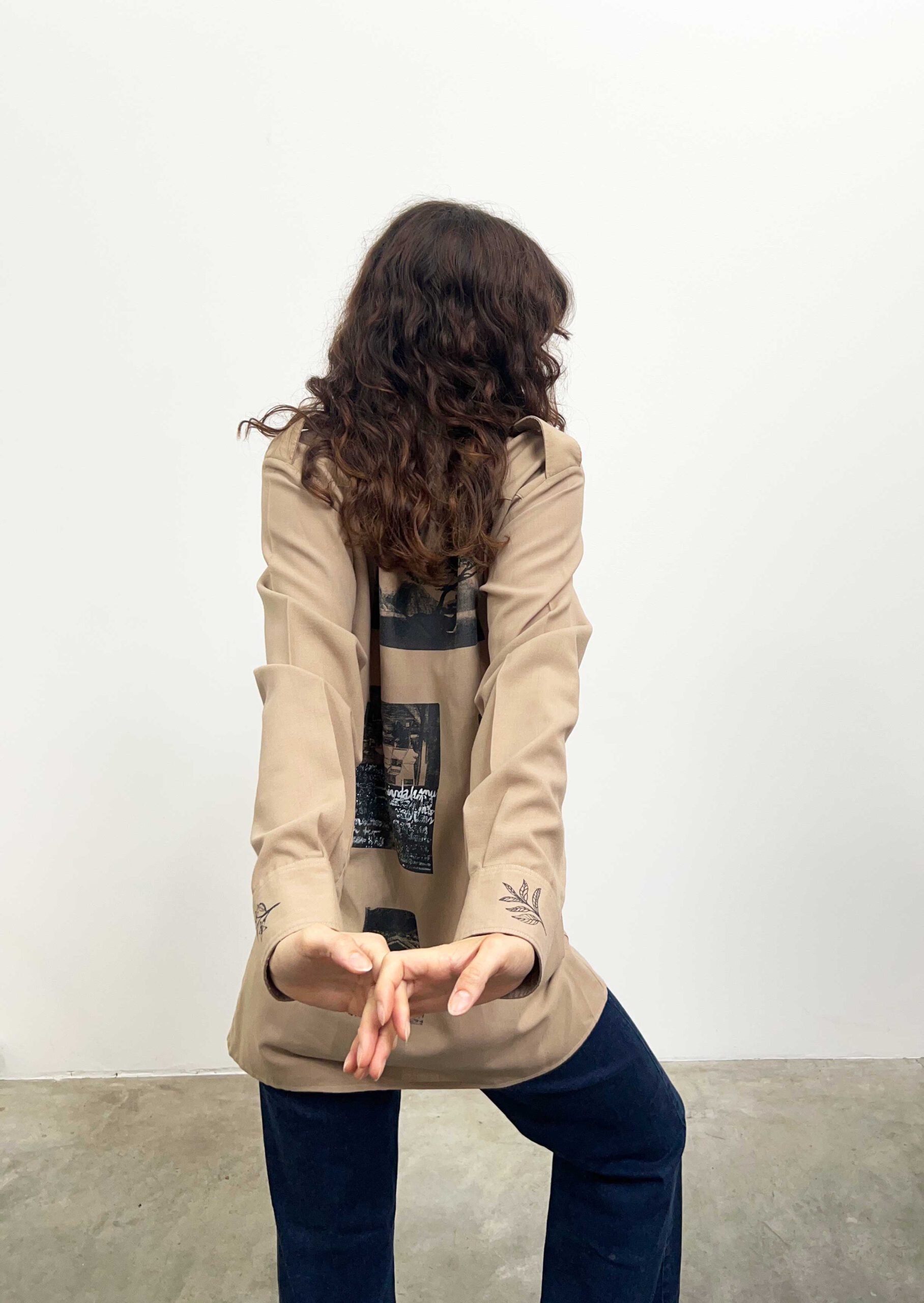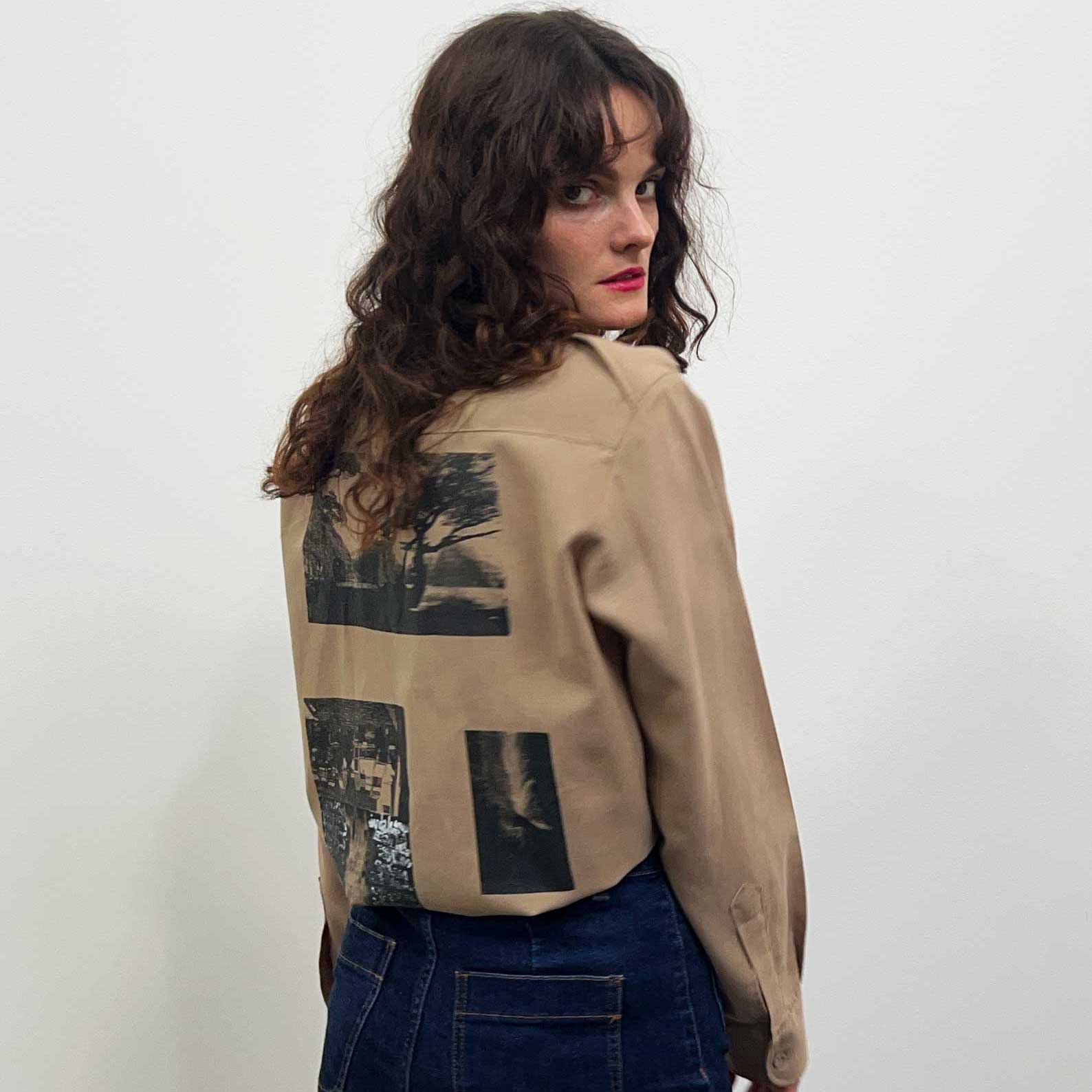 Shirt in beige colour. Upcycled with hand printed Katagamis and hand painted designs.